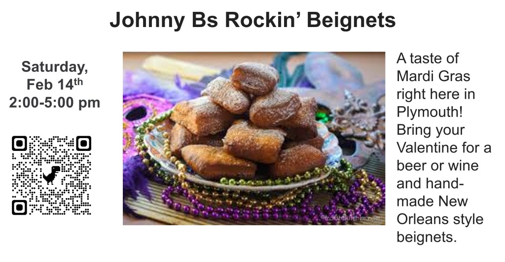 Saturday Feb 14, 2-5 pm. Johnny Bs Rockin’ Beignets Pop-Up. Yes, we are celebrating Mardi Gras on Valentine’s Day since we are closed on Tuesday Feb 17th.