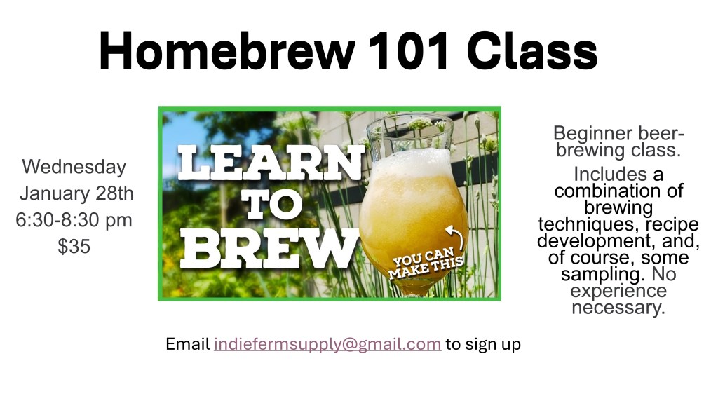 Wednesday, Jan 28th, 6:30-8:30 pm. An introductory course with a combination of brewing techniques, recipe development, and of course, some sampling. Sign up by emailing us at indiefermsupply@gmail.com. Cost of the class will be $35.